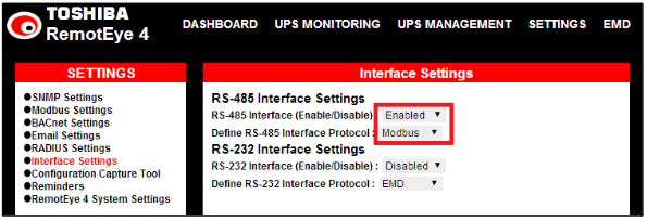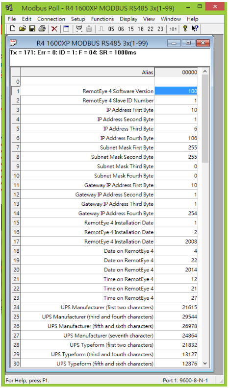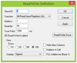 Software Configurations: 1) On the home page dashboard, click on the "SETTINGS" menu at the top of the page. This will bring up the "SETTINGS" drop-down menu. 2) In the "SETTINGS" drop-down menu click on “Interface Settings” the selected entry text will turn RED. 2.1) If using RS-485 2.1.1) Under “RS-485 Interface Settings” set "RS-485 Interface (Enable/Disable)" to “Enabled”, and set "Define RS-485 Interface Protocol" to “Modbus”. 2.1.2) Under “RS-232 Interface Settings” set "RS-232 Interface (Enable/Disable)" to “Disabled”, and set "Define RS-232 Interface Protocol" to “Disabled”. 2.2) If using RS-232 2.2.1) Under “RS-232 Interface Settings” set "RS-232 Interface (Enable/Disable)" to “Disabled”, and set "Define RS-232 Interface Protocol" to “Modbus”. 2.2.2) Under “RS-485 Interface Settings” set "RS-485 Interface (Enable/Disable)" to “Enabled”, and set "Define RS-485 Interface Protocol" to “Enabled”. 3) In the "SETTINGS" drop-down menu click on “Modbus Settings” the selected entry text will turn RED. 4) Look in the Protocol Settings Panel titled “Modbus Settings”. Under “Modbus RTU Settings” 4.1) set "Modbus RTU" to “Enabled”, 4.2) "Baud Rate" to the system baud rate (Default: 9600), 4.3) "Address" to the unit address (Default: 1). 5) Under “Modbus TCP/IP Settings” set "Modbus TCP/IP" to “Disabled”. 6) Click the "Set" button. 7) Configure the Connection Setup with master as follows: 7.1) Connection: Serial Port 7.2) Port Settings: Port 1, 9600 Baud, 8Data bits, Non Parity, 1 Stop bit 7.3) Mode: RTU 7.4) Slave ID: 1 (There can be from 1-247 Slave units, each with a unique ID, connected to each Master unit.) 8) Set the Read/Write Definition (E.g. the Read registers are 30001 – 30030) Example Read/Write setup Example of Polled Data |