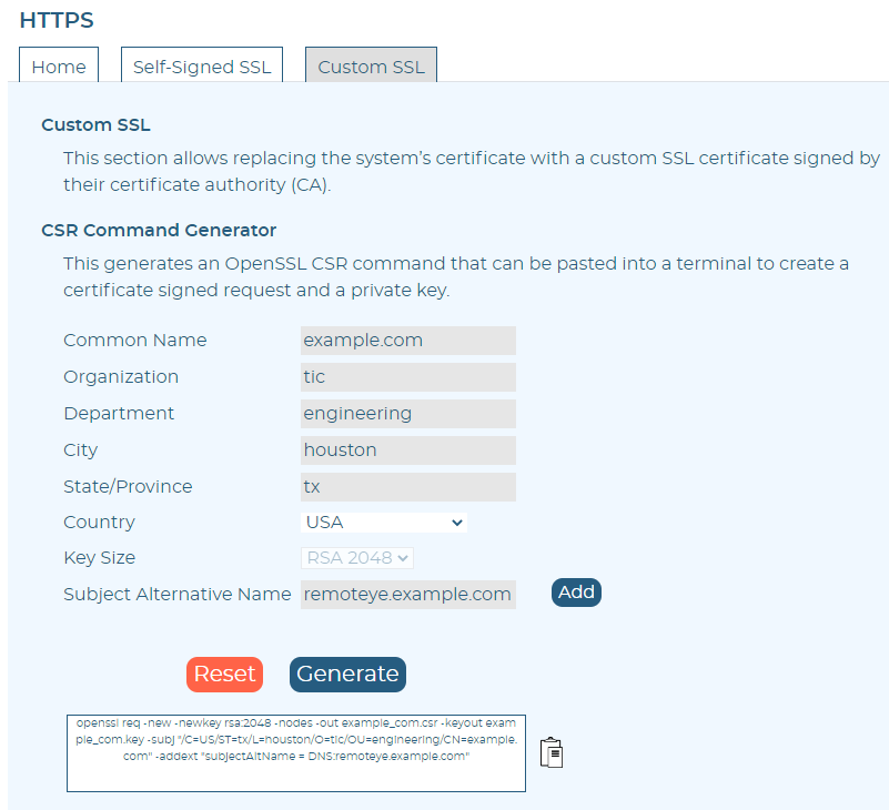 - Fill out the OpenSSL CSR Command Generator under Settings > Security > HTTPS > Custom SSL, copy, paste, and execute the command on a terminal in a separate machine.